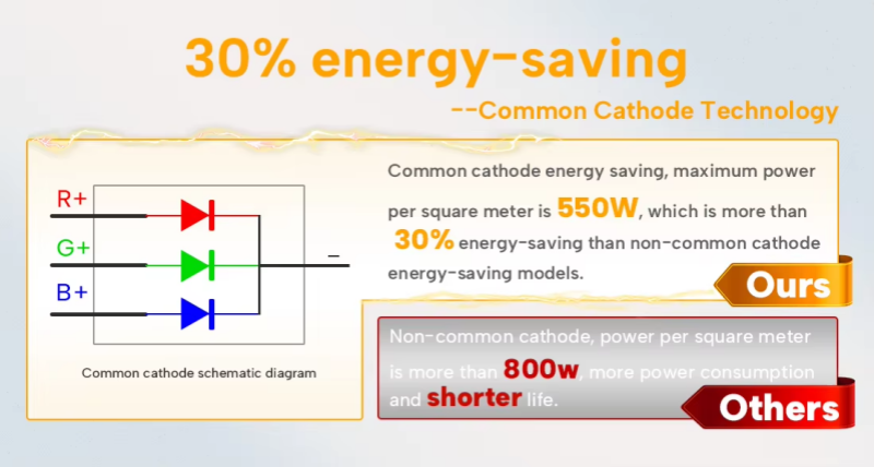 The most significant feature of common cathode technology is that current flows directly to the cathode of the LED chip. Through precise power supply and efficient energy utilization, It significantly lowers energy consumption. At the same brightness, it avoids the energy waste caused by voltage redundancy in common anode power supplies. Resulting in energy savings of over 30% compared to non-common cathode models.