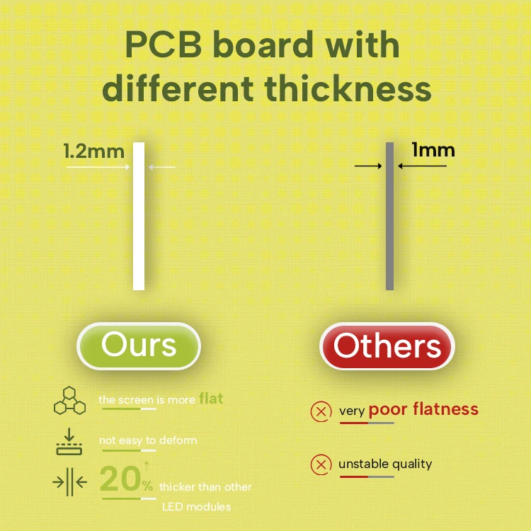 1.6mm PCB board, 33% thicker than other LED modules, not easy to deform, so the screen is more flat.