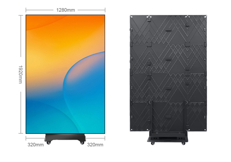 Tri-fold LED display adopts a core structure of left and right tri-folding, achieving seamless switching between “large unfolded screen + folded screen”. In addition, when unfolded, it presents a seamless screen body of standard poster size of 1280×1920mm, and when folded, it transforms into a small screen of 640×1920mm.